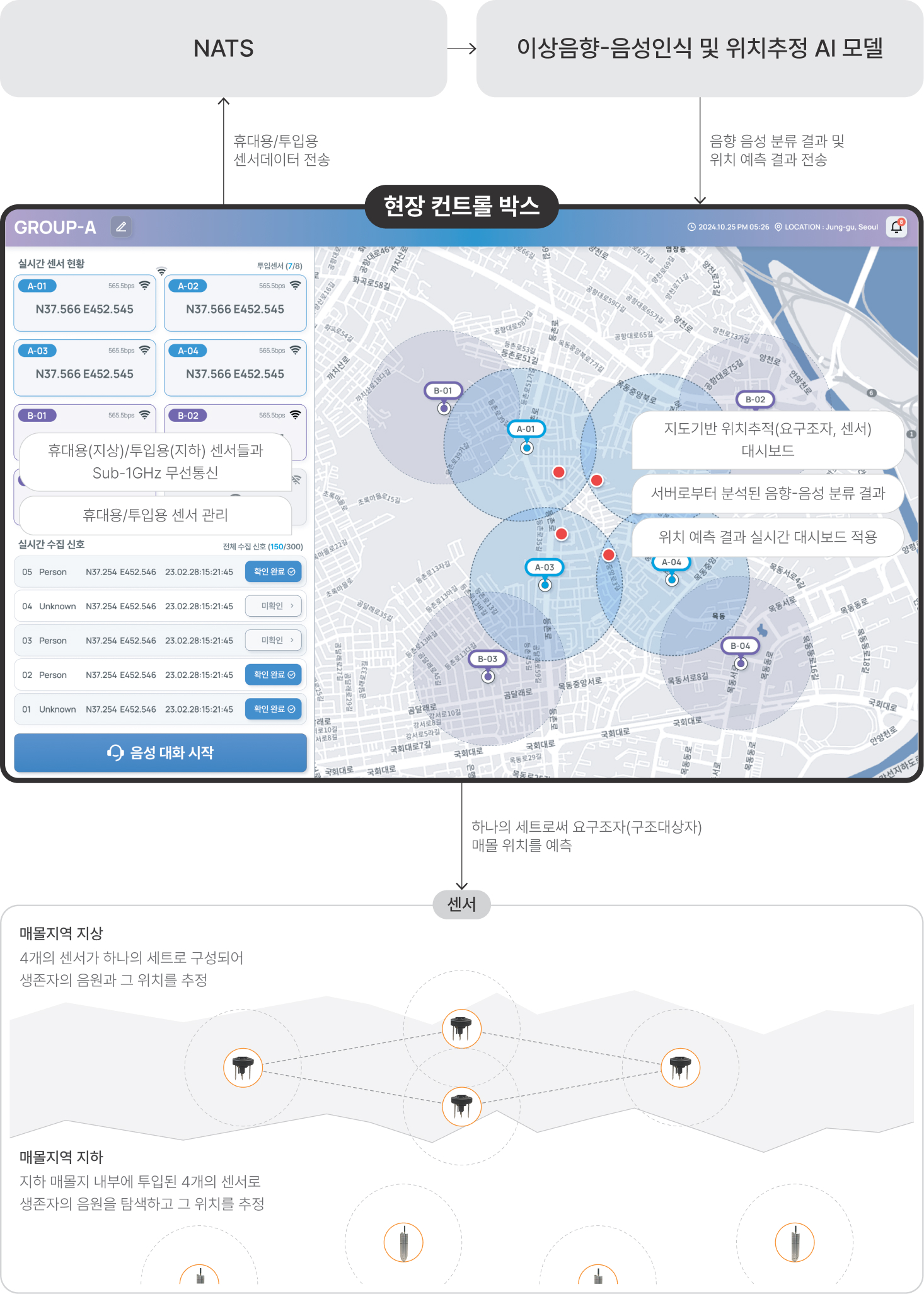 분산된 센서 신호를 AI가 분석·통합하여 구조대 관리자가 위치를 확인.